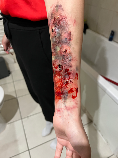 Description: For this makeup, the pitch was to create a makeup representing mold on the arm of the main character. Mold only herself could see. The effect aimed was able to remove it as she was scarifying herself.